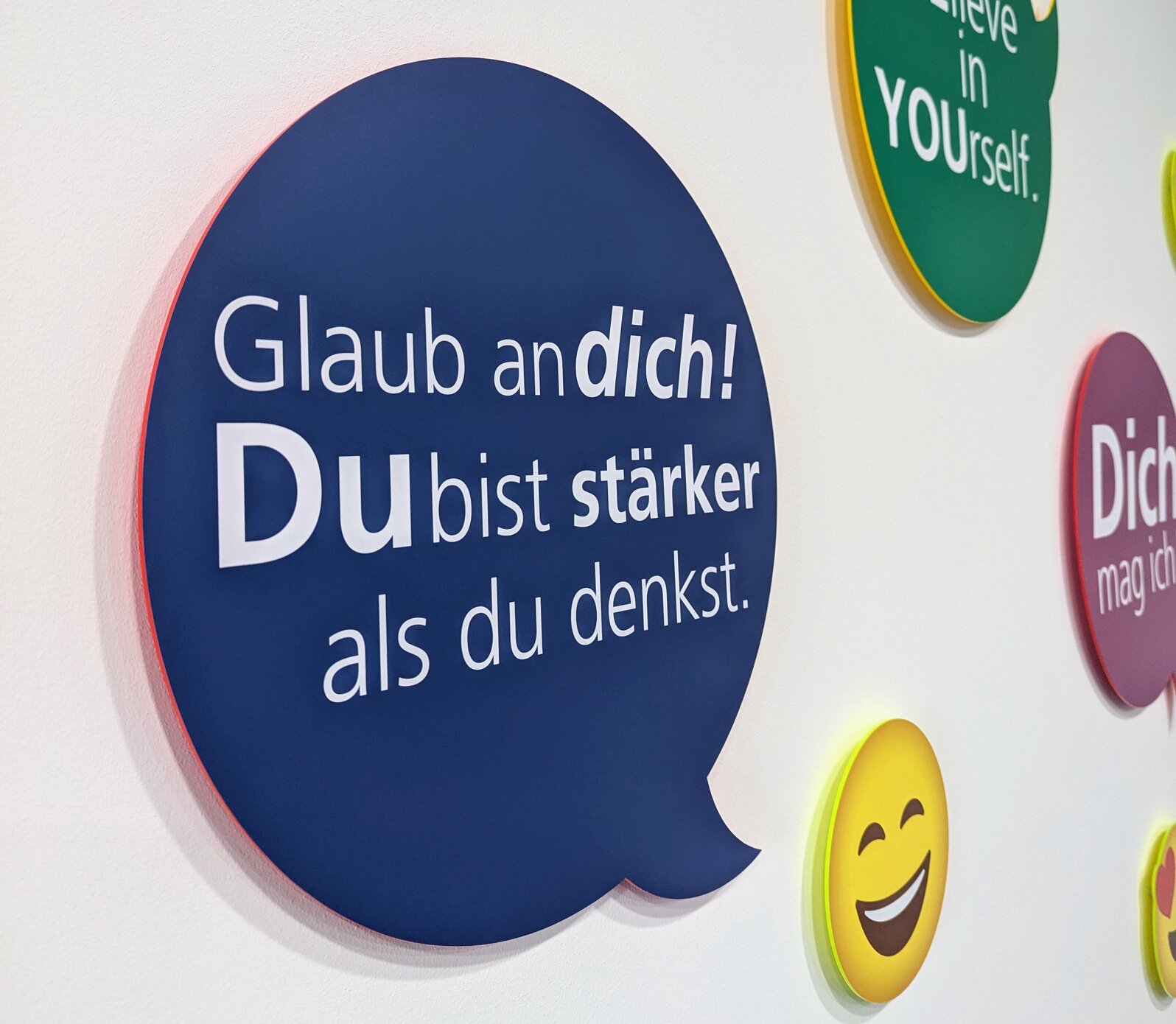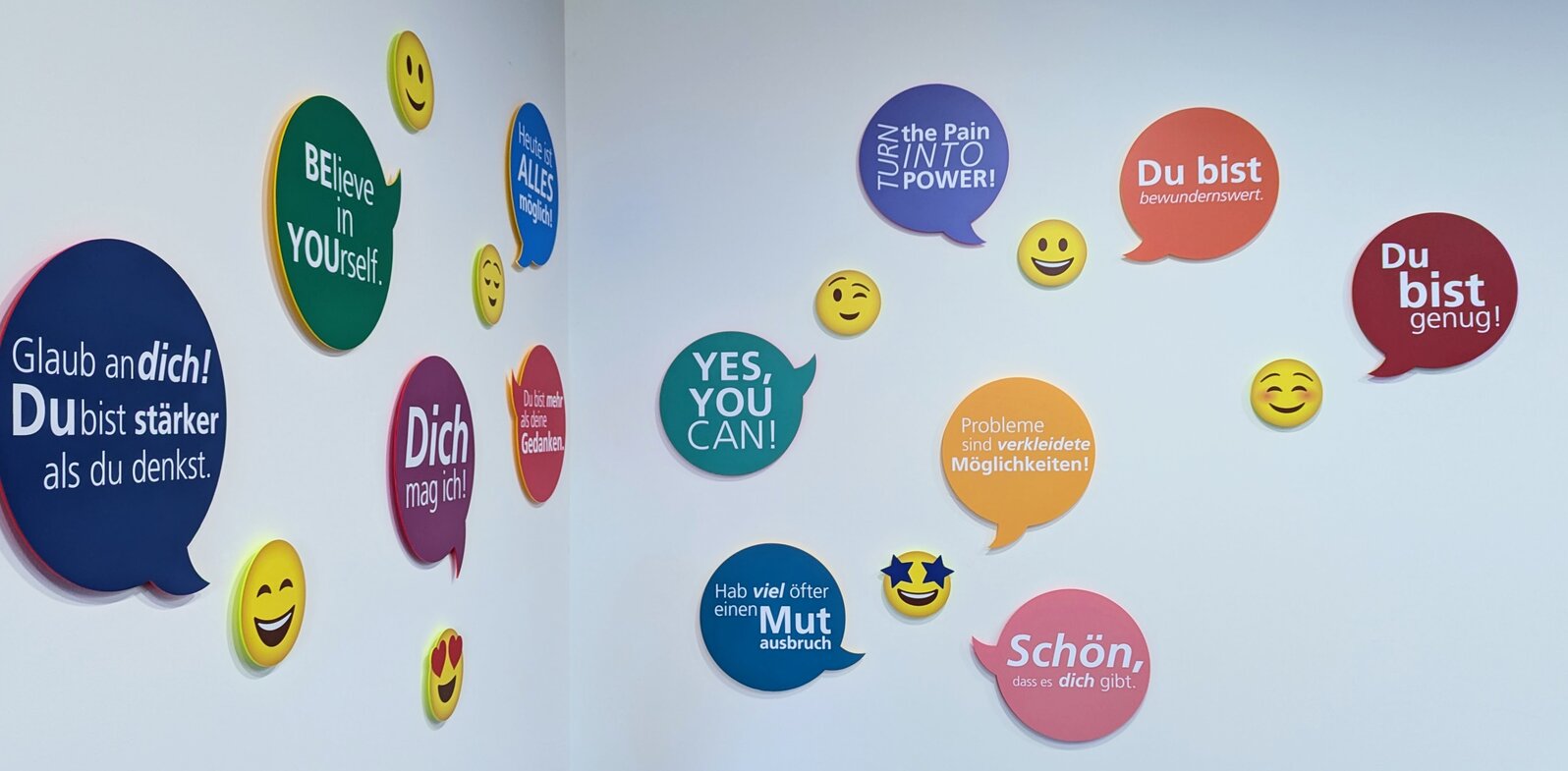 Beim Betreten der Ausstellung werden Sie in der „GLÜCKSECKE“ von einem bunten Regenbogen aus freundlichen Smileys und motivierenden Sprüchen an den Wänden begrüßt. Jeder Spruch wurde sorgfältig ausgewählt, um Hoffnung und Ermutigung zu vermitteln. Hier finden Sie Sätze wie „Du bist stärker als du denkst“ oder „Es ist in Ordnung, nicht in Ordnung zu sein“. Diese Botschaften sind nicht nur Worte, sondern Ausdruck der Erfahrungen und der Resilienz der ausstellenden Personen.